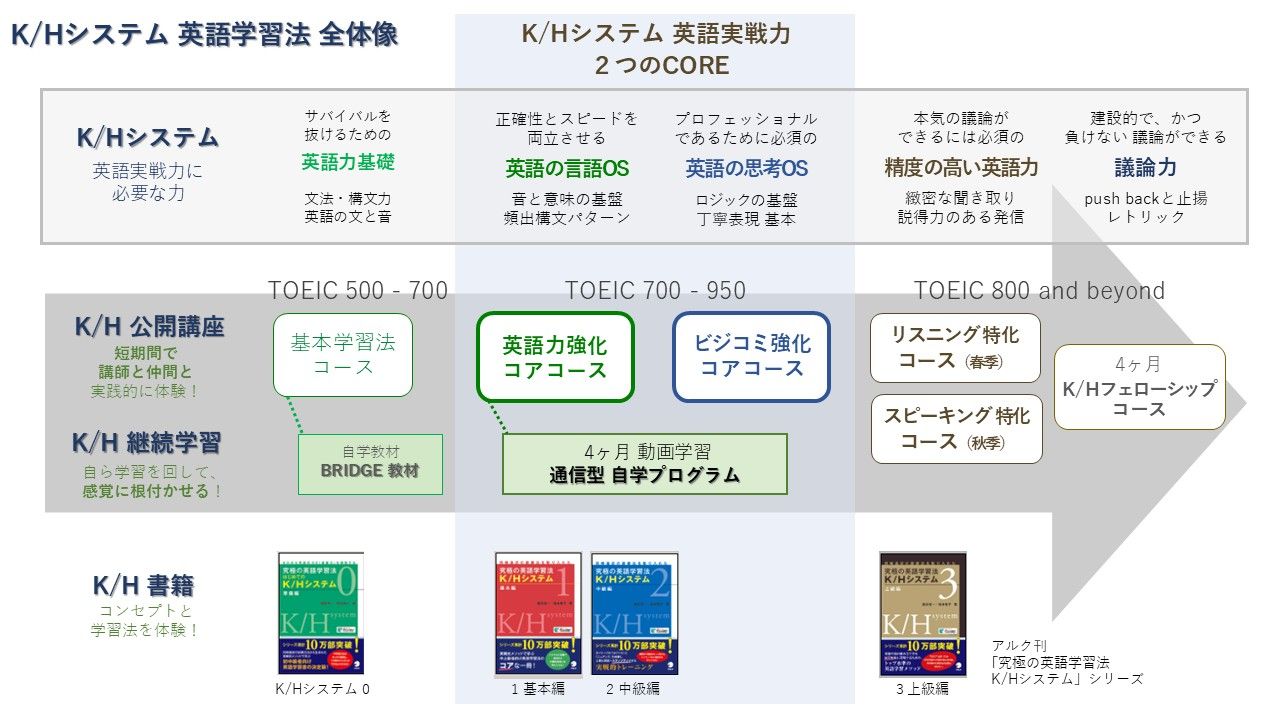 英語の基本文法・構文をまず復習したい初級者向けのコースです。K/Hシステム学習法の基本エッセンスを実践的に身につけます。「とにかく英語に触れる・語彙を増やす」を超えて、英語の構造の違いゆえの 「日本人にとっての難しさのポイント」を理解し、それらを克服するための学習法を体験します。