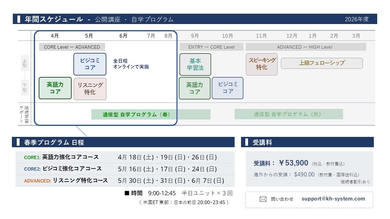 英語の学習方法そのものを、実践的・体験型で学ぶセミナーです。春・秋に開講される公開講座をマイルストーンとし、学習を継続しながら、初級から超上級レベルまで中長期的に力を伸ばしていく設計になっています。