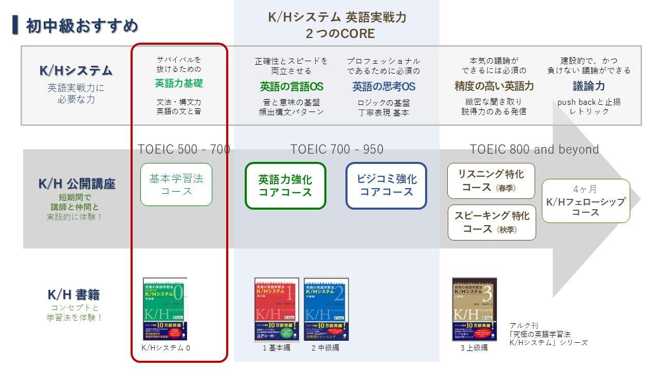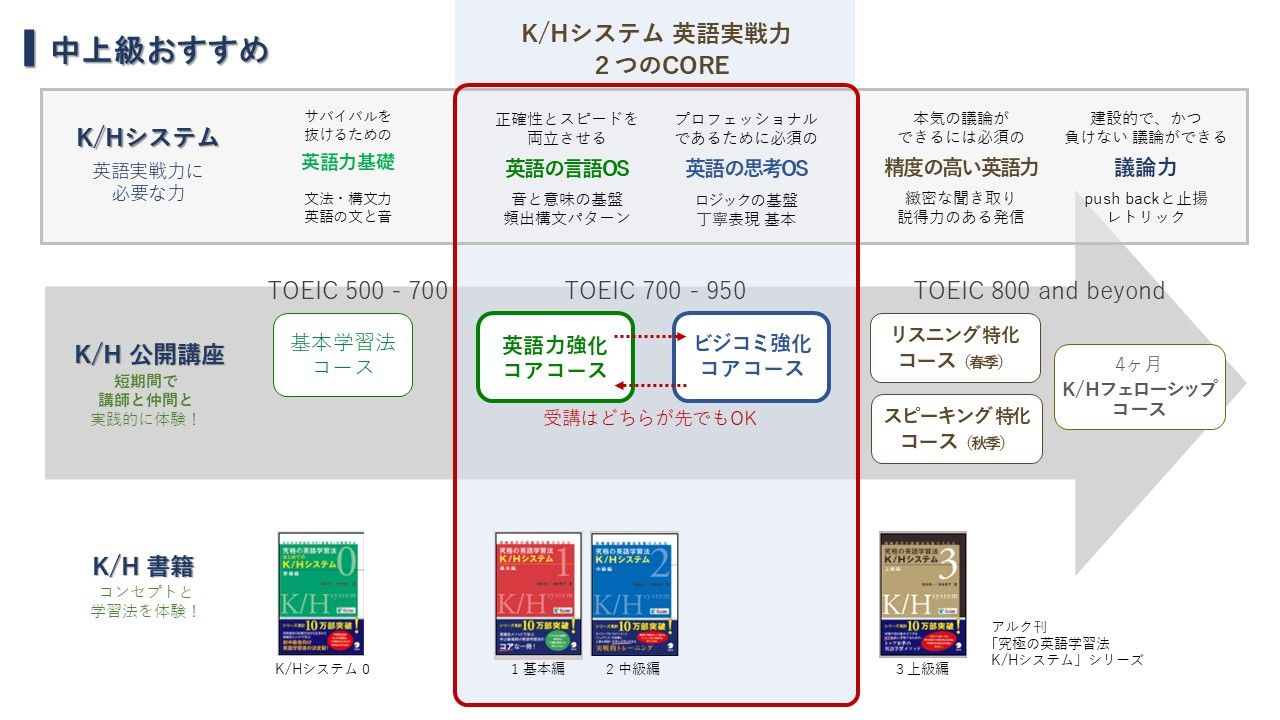 - K/H学習法全体の中で、現時点で本で出版しているのは英語学習法の基本的な部分に限られます。英語力自体の底上げに加え、他にもビジネスのコミュニケーションの効果を飛躍的に高めるのに必須の視点と、コツ・工夫ポイントを学ぶコースが複数開講されています。また、どのコースでも、こうした視点から、複層的で奥行きのある学びが得られます。