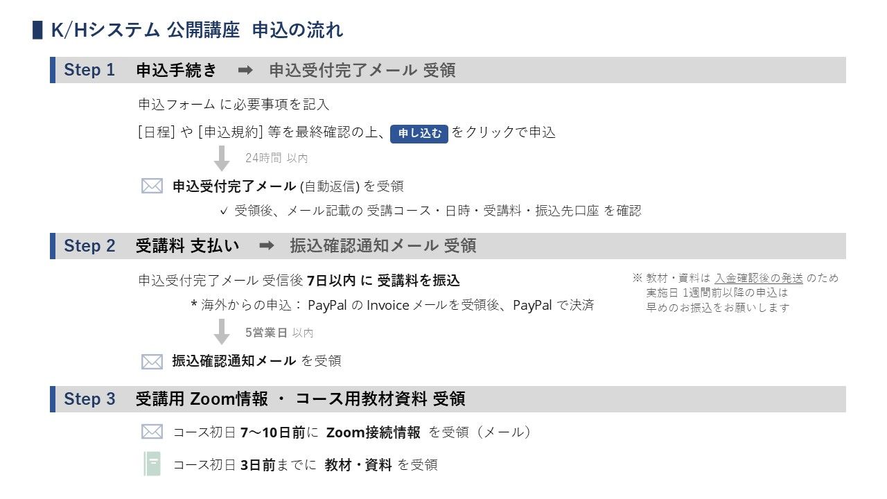 ②市販の「はじめてのK/Hシステム」か「K/Hシステム基本編」の、冒頭にある学習法の解説部分を読んでおく。学習法の考え方が前もって少し見えることによって、コースでの理解がより容易になると思います。